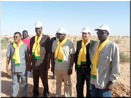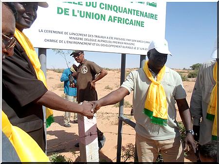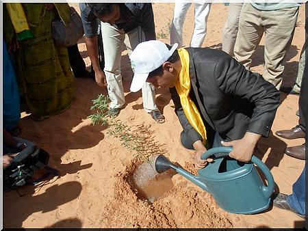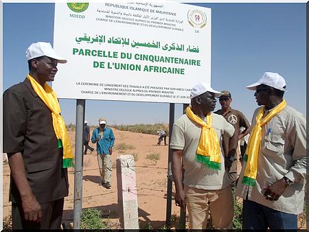 Le Ministre Délégué auprès du Premier Ministre chargé de l’Environnement et du Développement Durable Son Excellence Monsieur Amedi Camara a également procédé, en compagnie du Secrétaire Exécutif de l’Agence Panafricaine de la Grande Muraille verte, à une plantation symbolique de quelques dizaines de plants au niveau des parcelles du bloc 7 de la ceinture verte de Nouakchottdédiées à « la Paix et l’Amitié des Peuples » et au « Cinquantenaire de l’Union Africaine ».        |