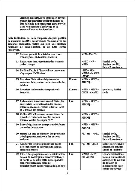 La feuille de route comprend 29 recommandations qui ont trait au corpus juridique, aux domaines économique et social et à la sensibilisation indispensable pour éradiquer les séquelles de l’esclavage.Au niveau juridique, la feuille de route recommande la révision de la loi pour y introduire les nouvelles formes d’esclavage et des mesures sur la discrimination.