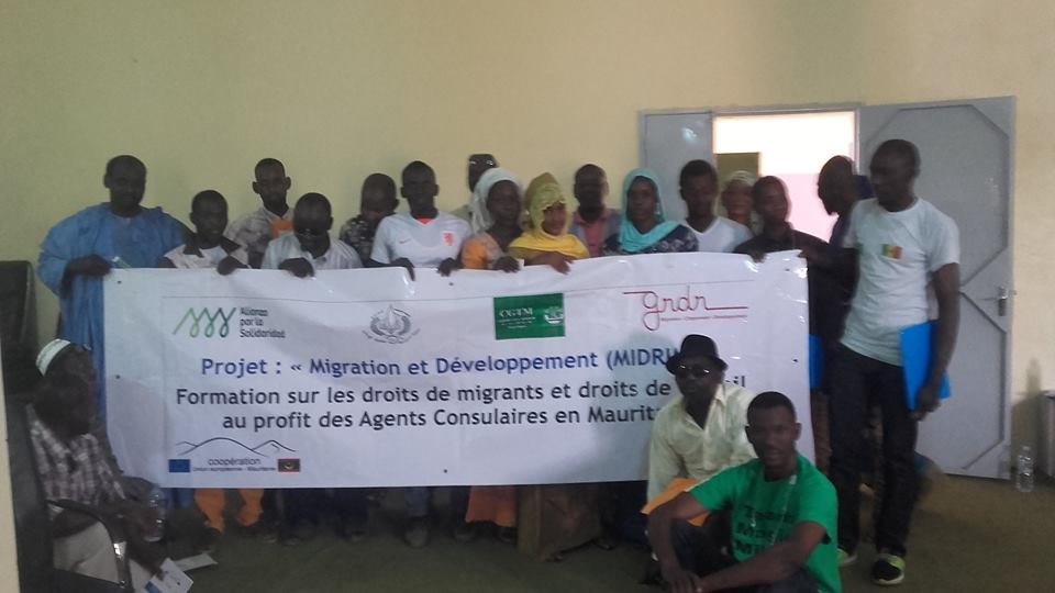 Dans le cadre du Projet : Migration et Développement (MIDRIM) mis en œuvre par un consortium d’ONG les locaux de la maison du Guidimakha ont servi de cadre aux travaux d’un atelier de formation sur les droits des migrants et droits du travail. Ce samedi, 3 mars 2018 don a eu lieu à Sélibaby, la capitale du Guidimakha l’ouverture d’un atelier de formation sur les droits des migrants et droits du travail. Atelier organisé par l’AMDH en partenariat avec le GRDR, la CGTM et ALIANZO por la Solidaridad. Cet atelier de deux jours qui s’inscrivant dans le cadre de la formation des communautés étrangères vivant en Mauritanie vient aussi en appui aux associations des migrants et des OSC afin de les outiller sur les instruments nationaux et conventions internationales de protection des droits des migrants. S’appuyant sur l’article 21 de la constitution mauritanienne de 1991, des lois, des décrets et d’ordonnances Mr Amadou Bocar Ba, le coordinateur régional de l’AMDH au Guidimakha assurant la formation a fourni d’amples explications sur la protection des migrants. Parlant de ces derniers et des conventions ratifiées par la Mauritanie, il a souligné que les migrants sont protégés contre les différentes formes d’exploitation, de traite de personnes ou autres pratiques inhumaines. la convention de Genèvre de 1952 et ses protocoles additionnels, la convention de l’OIT et la ratification par la Mauritanie des conventions internationales l’engagent à respecter les droits socio économiques, politiques, civils et culturels des migrants et des travailleurs migrants sur son sol. Au coordinateur de l’AMDH de préciser aussi que cette formation s’inscrit dans le cadre de la mise en œuvre de l’activité 6 qui vise la formation des agents consulaires aux droits des migrants. S’exprimant également au nom de la CGTM, il a permis aux participant à l’atelier d’échanger et d’acquérir des notions sur des mots clefs que sont la migration, la traite des personnes et le trafic illicite des migrants, les droits socio économiques et culturels, la législation nationale et conventions bilatérales et internationales sur la migration, l’appui à l’organisation et la structuration des migrants. Abordant la question du droit de la migration et celui du travail, le formateur a mis l’accent sur les aspects spécifiques relatifs aux migrants .Et d’insister sur les conditions d’entrée, de séjour, la procédure d’obtention de permis de travail pour les étrangers, le transfert financiers des migrants, l’assistance juridique en matière de conflit de travail. A l’entame des travaux de cet atelier d’échange organisé au profit des communautés étrangères vivant au Guidimakha et des OSC, le point focal de la migration et développement au niveau de la cellule du GRDR dans cette région frontalière avec le Mali et le Sénégal a souligné l’importance d’une telle rencontre avant de remercier l’AMDH pour son engagement pour défendre les droits des migrants. Les représentants des maliens, sénégalais, Ghanéens, des Gambiens, des ressortissants du Niger, du Nigeria vivant au Guidimakha se disent satisfaits de l’organisation d’une telle rencontre avant de demander l’o